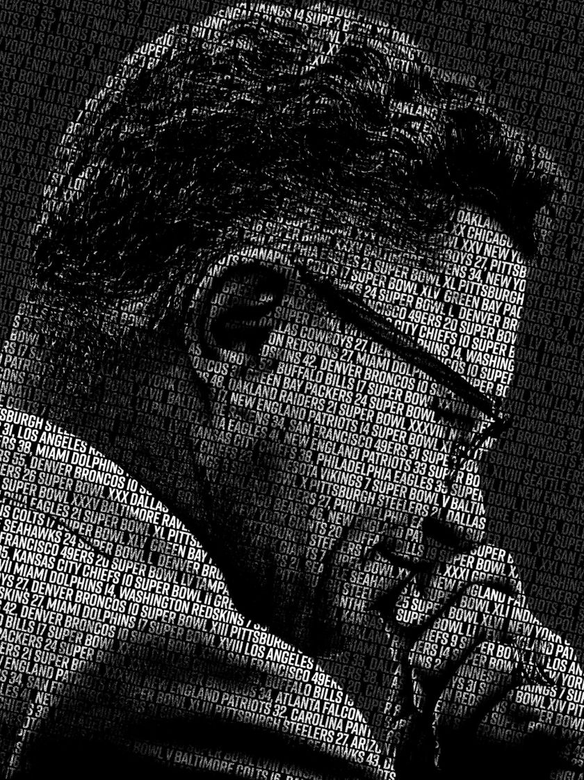 Lombardi Bowl 59 is a tribute to the man who set the standard for greatness. Built from the written history of every Super Bowl ever played, the portrait recreates Vince Lombardi using the very match-ups that followed in his footsteps. His face emerges from decades of football milestones, beginning with the first two championships he led and forever shaping the identity of the game.